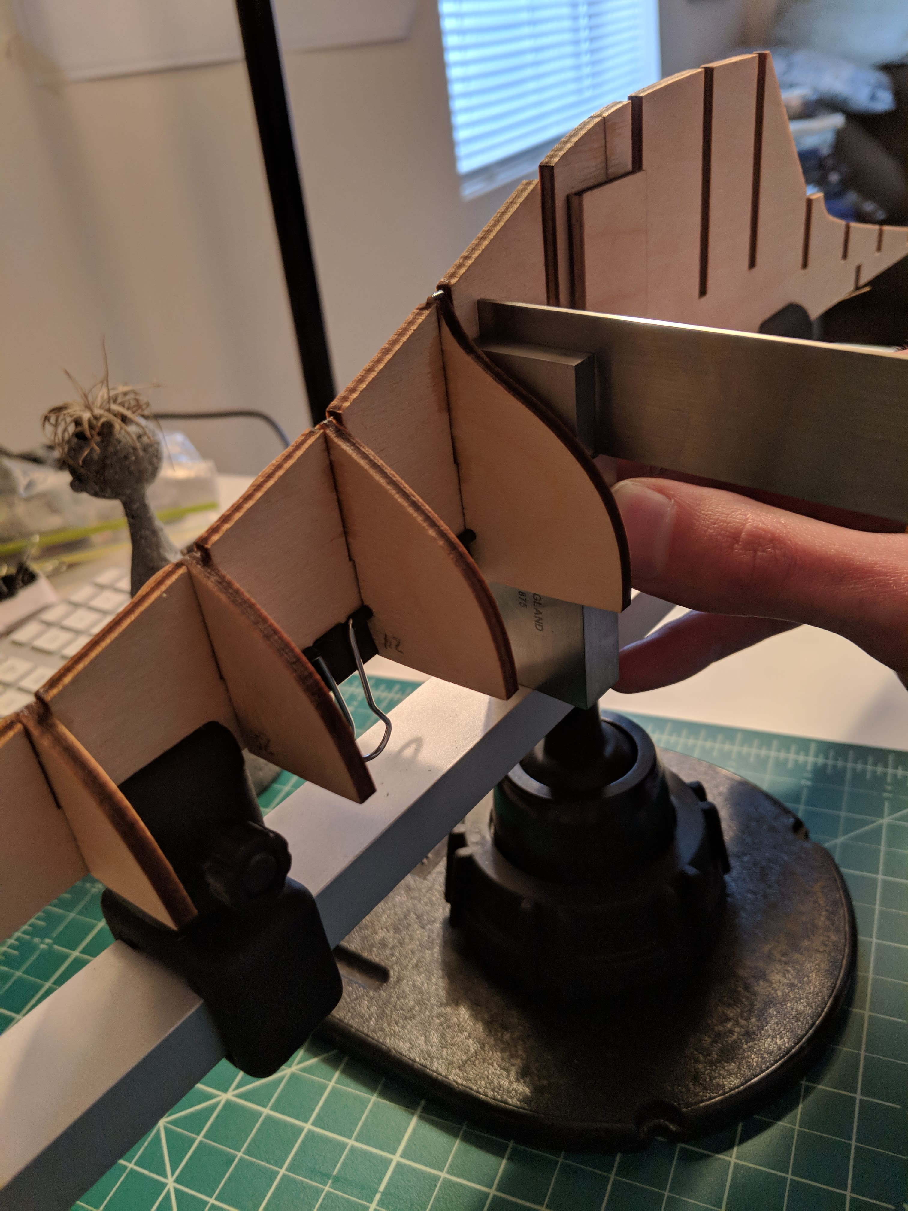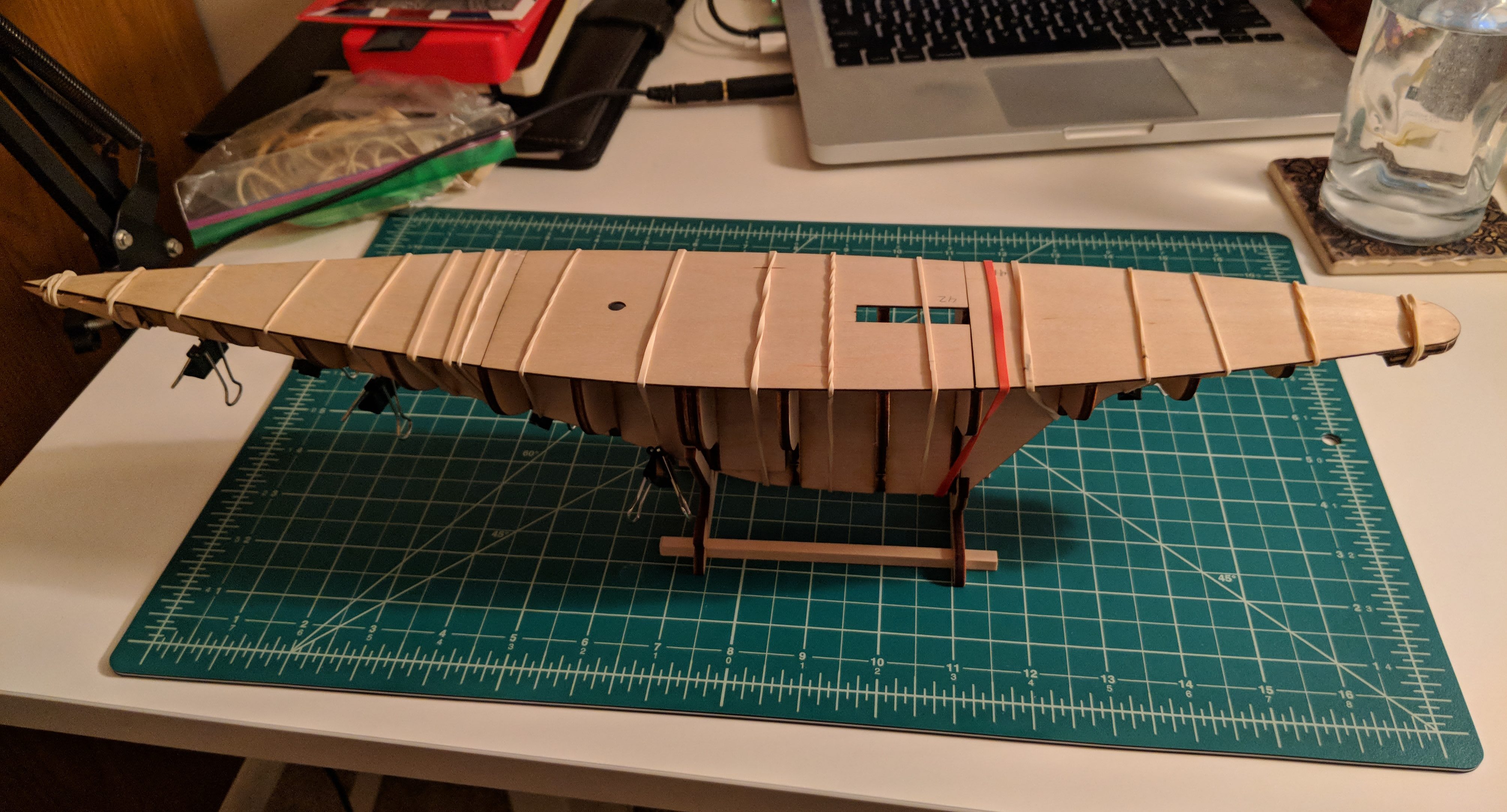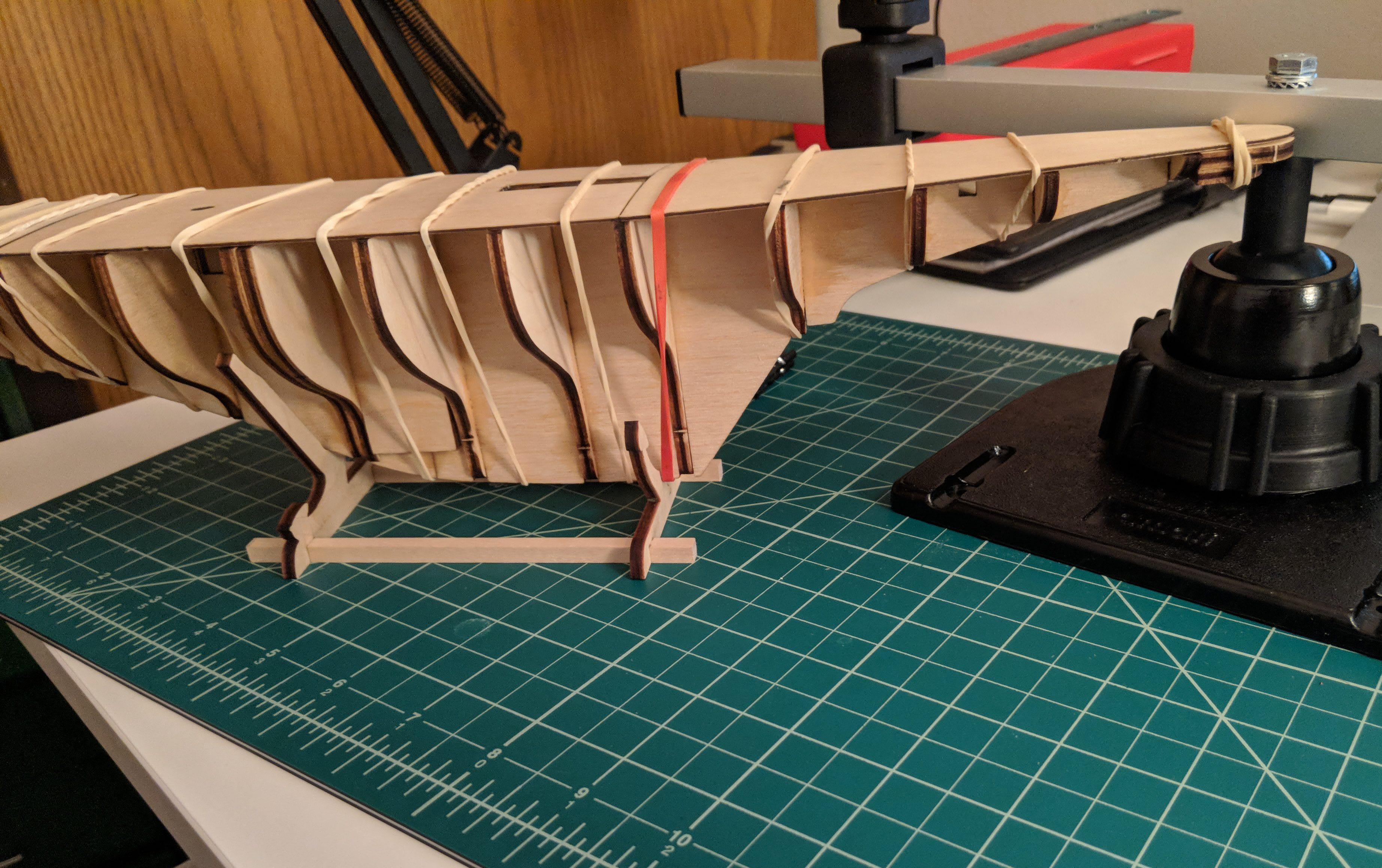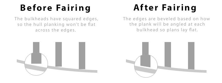 Details will be included to elaborate on each picture below, but this process is basically focused on keeping the bulkheads square, sanding it all level to add the false deck, and then fairing the edges of each bulkhead so that the subsequent hull planking has as much surface area to adhere to as possible. The first image below illustrates why hull fairing is important prior to beginning to lay the planks. Without fairing, then the planks only touch each bulkhead on the corner edge and don't form a solid bond. But, after sanding down the edges to more fully bring out the elegant contours of the hull, then each plank can adhere to the full curve of the bulkhead ends and form a tight bond with no bumps or flaws.