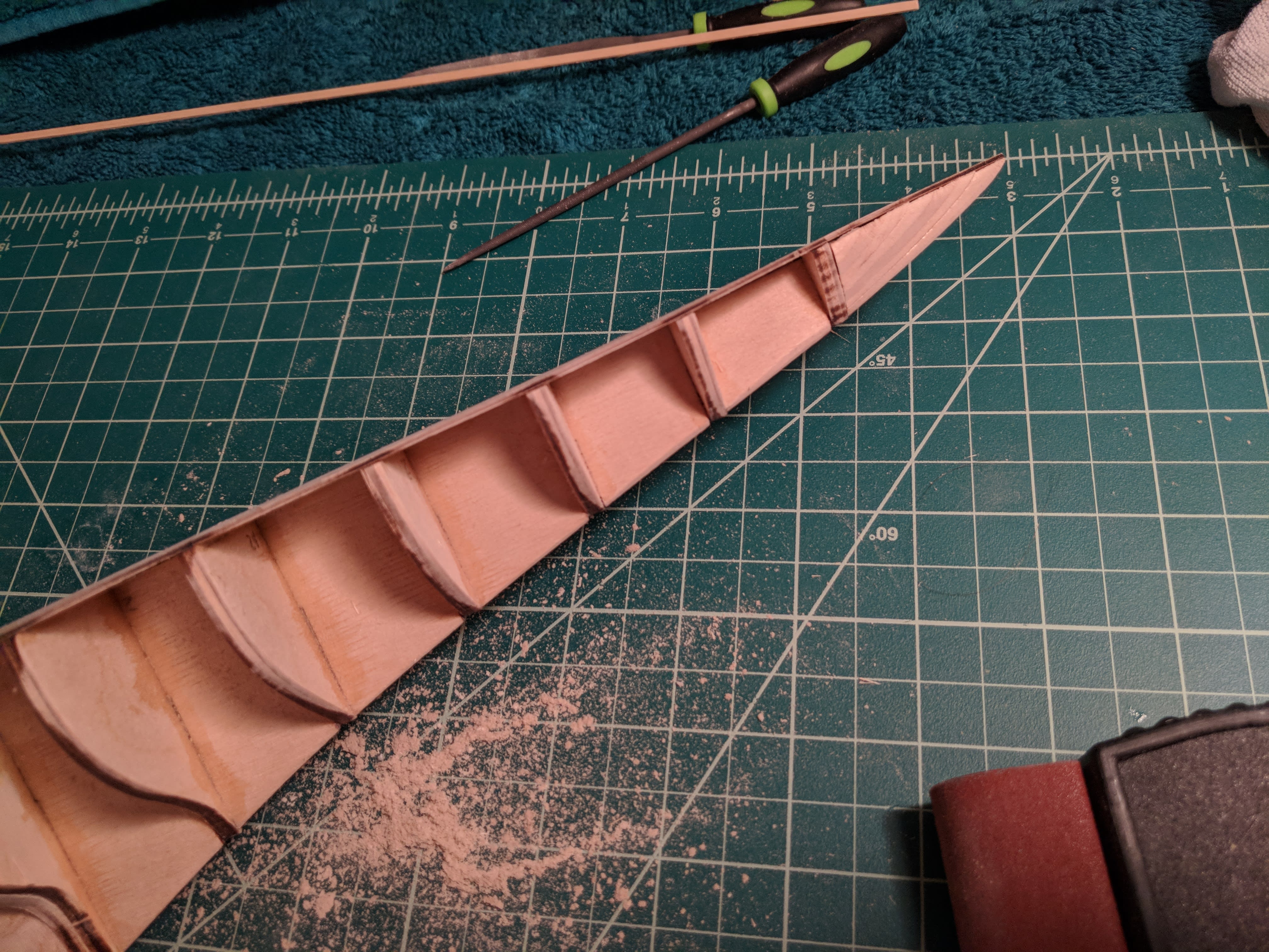 Filing down the filler blocks at the stern to bring out that rounded end. Probably would have gone faster with a Dremel, but there's just something about building a boat by hand.