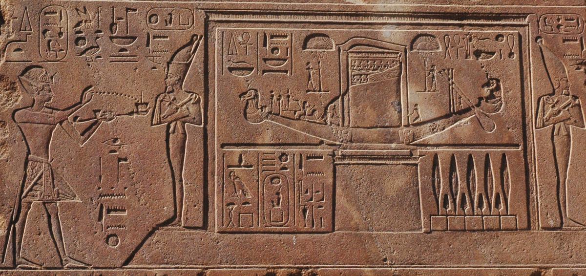 From the outset of the story we’re told that it concerns the voyage of Wenamun, who is called the Elder of the Portal of the Temple of Amun. He’s a priest of the temple then, and we’re told that the High Priest has charged Wenamun with overseeing a voyage to Byblos to fetch timber for the “great noble bark of Amun-Ra.” We talked a lot in the first half of Season 1 about the place of boats within the Egyptian religious mindset, with that place having probably come about because of the centrality of the Nile to the very existence of Egypt’s culture. Commonly, religious barks would fall into two categories: a portable bark such as could be displayed within the temple of a particular god or carried during the land portion of the god’s procession festival, and a full-sized, sea-worthy bark that could be used as a festival ship for the relevant festival during which the god was recognized. The episode art for this episode is actually a photo of the sacred bark of Amun-Ra as it is depicted at Seti I’s temple in Abydos. I’ve posted a high-res copy of the whole scene from the temple, in all its beautiful color, so find that in the show notes if you like.